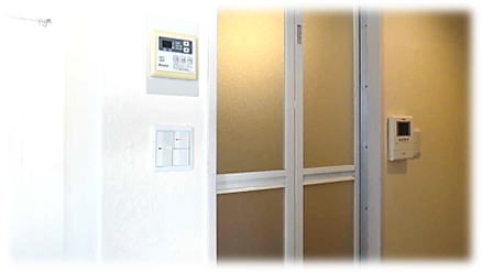 ユニットバスドア左側の壁に給湯器リモコンがあります。