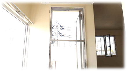 窓を開いてロックし左右から2枚の網戸を取り付けた様子です。